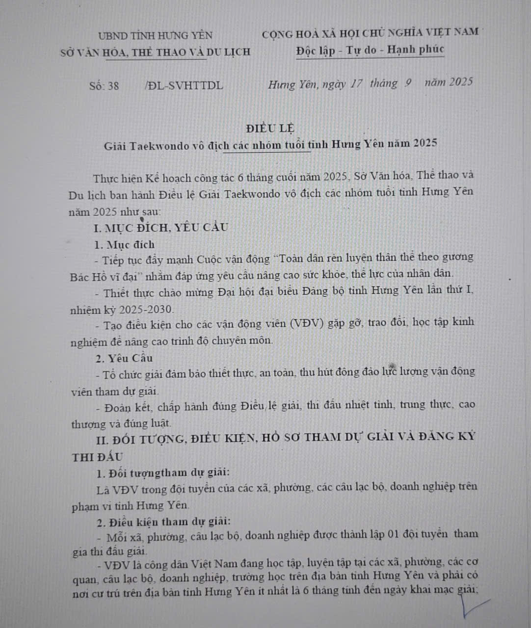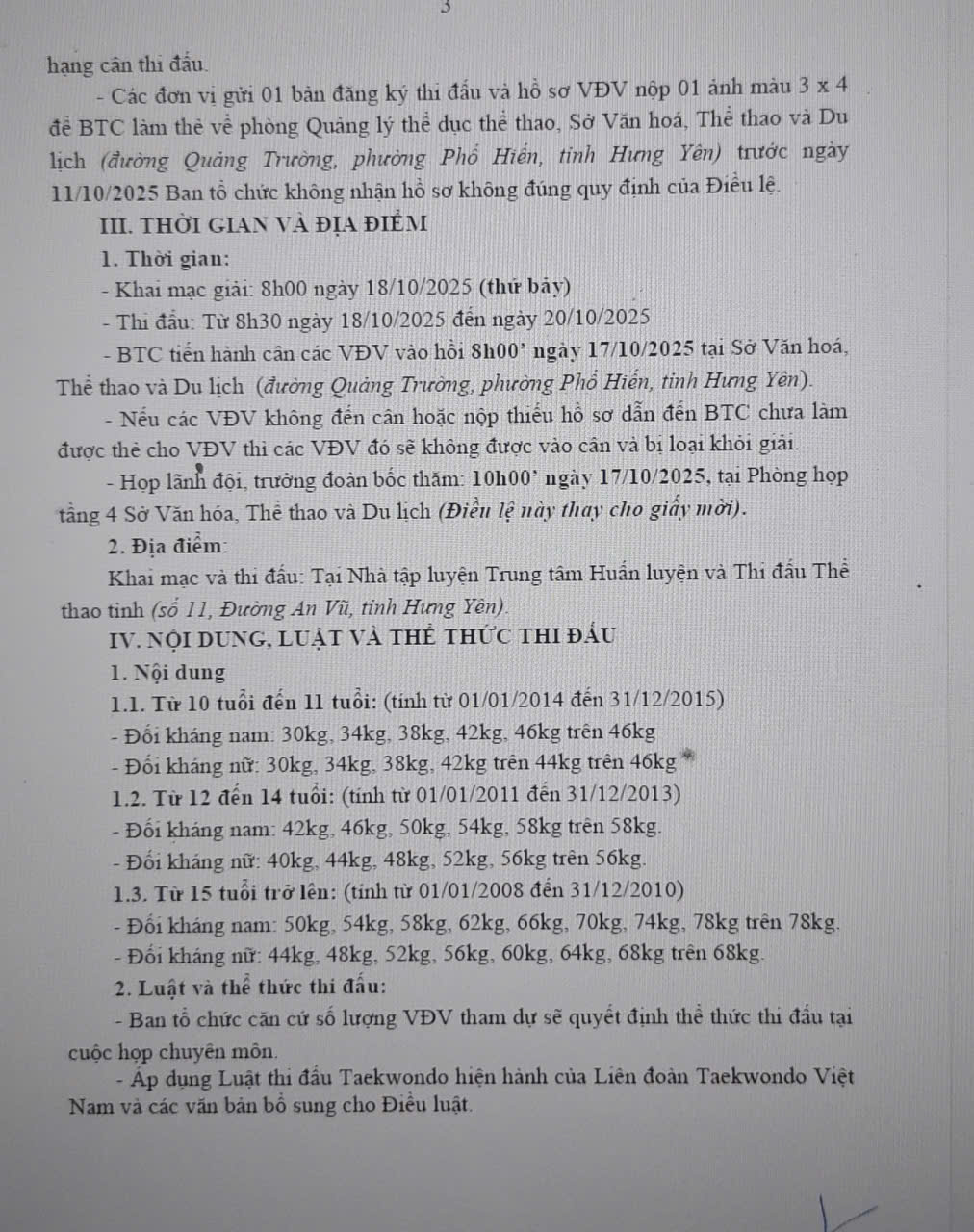 ĐIỀU LỆ GIẢI TAEKWONDO VÔ ĐỊCH CÁC NHÓM TUỔI TỈNH HƯNG YÊN NĂM 2025