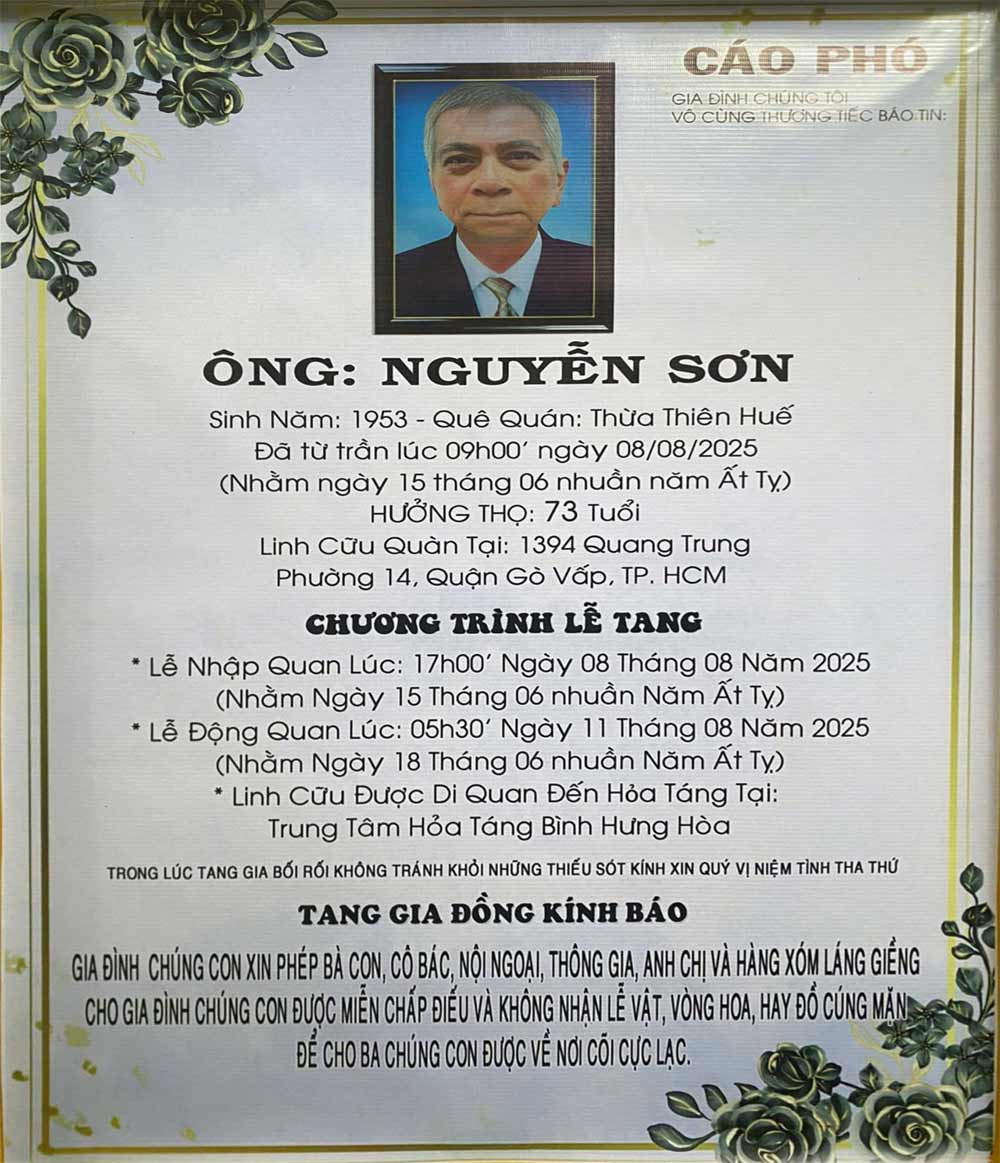 Lễ tang được tổ chức tại Thành phố Hồ Chí Minh, sau đó là lễ hỏa táng tại Trung tâm Hỏa táng Bình Hưng Hòa.